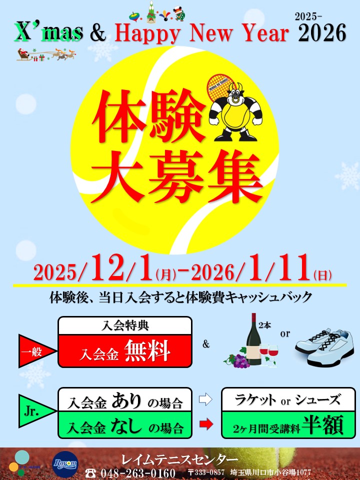 入会キャンペーン【12/1(月)~1/11(日)】開催いたします!! 2025.11.22 Tweet Share Hatena Pocket RSS feedly Pin it 上記期間にご入会の方には、お得な特典がいっぱ~い(*^_^*) テニススクールをお探しの皆様、是非ともこの機会お見逃し無く!! Tweet Share Hatena Pocket RSS feedly Pin it 12月のレッスン休講日のお知らせ(2025.11.01)