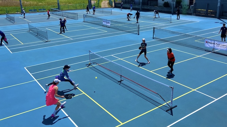 バドミントンコートとほぼ同じ大きさのコートで、卓球のラケットにも似た板状のパドルで穴あきのボールを打ち合う様子は「テニスに近いスポーツ」とも言えます。